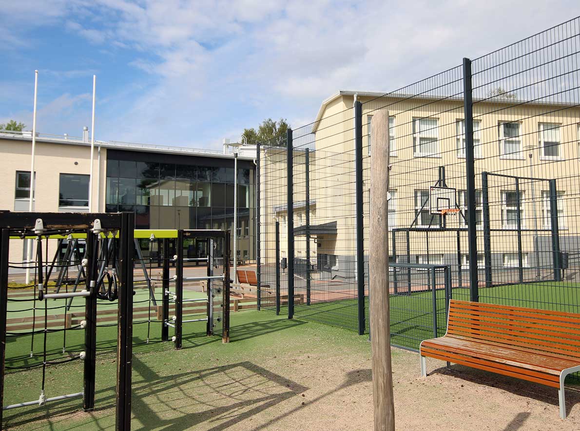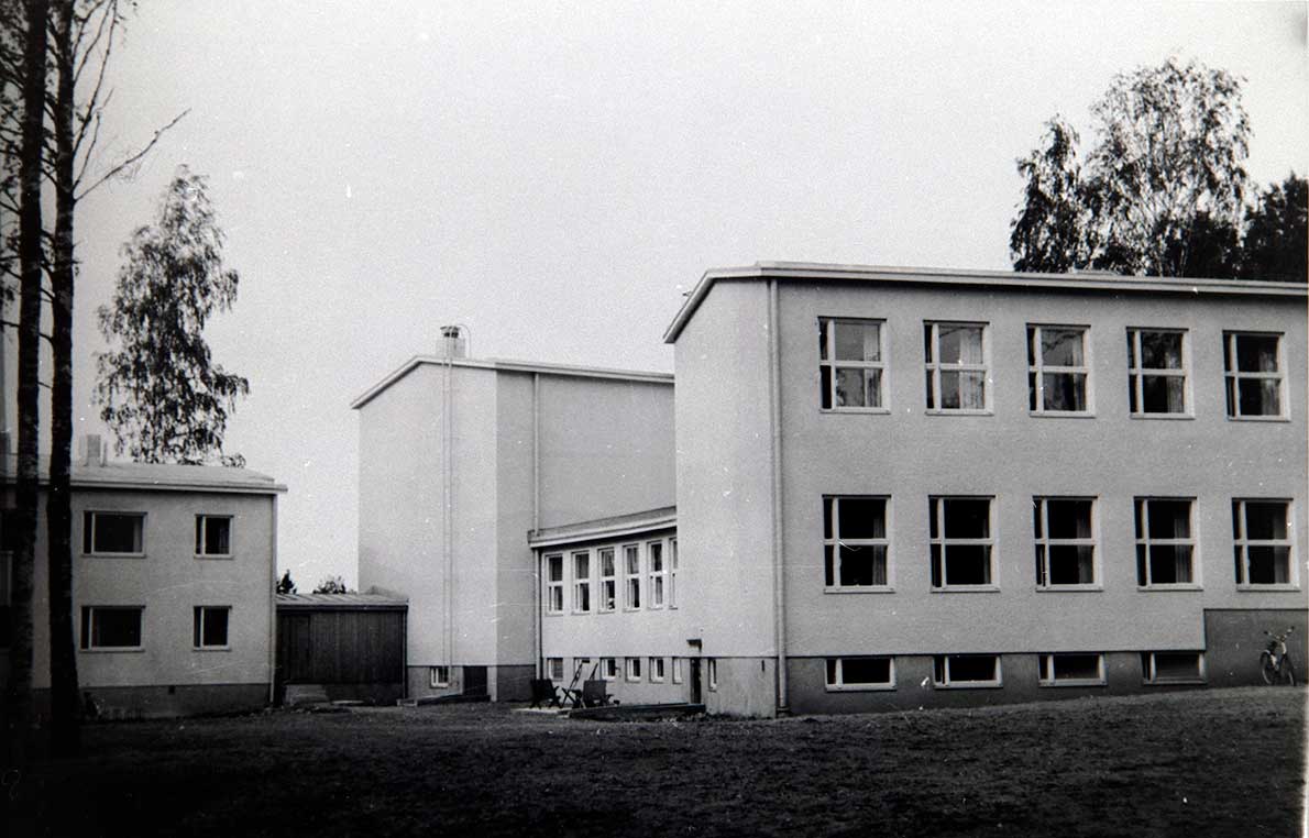 Tässä on Tuomarilan koulu vuonna 1957. Vasemmalla näkyy opettajien asuntolan pääty. Kuvaaja tuntematon, Espoon kaupunginmuseo.