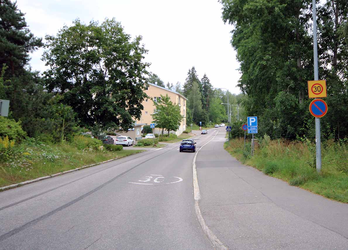 Tässä lähes sama paikka nyt. Varsinainen kuvauspaikka olisi ollut vähän lähempänä katua, mutta siinä oli rakennus. Myymälänhoitajan asunto sijaitsi noin lähempien parvekkeiden kohdalla. Huomatkaa vaalea omakotitalo taustalla.