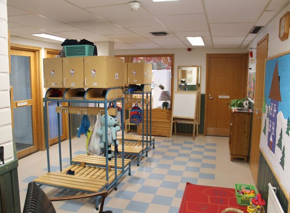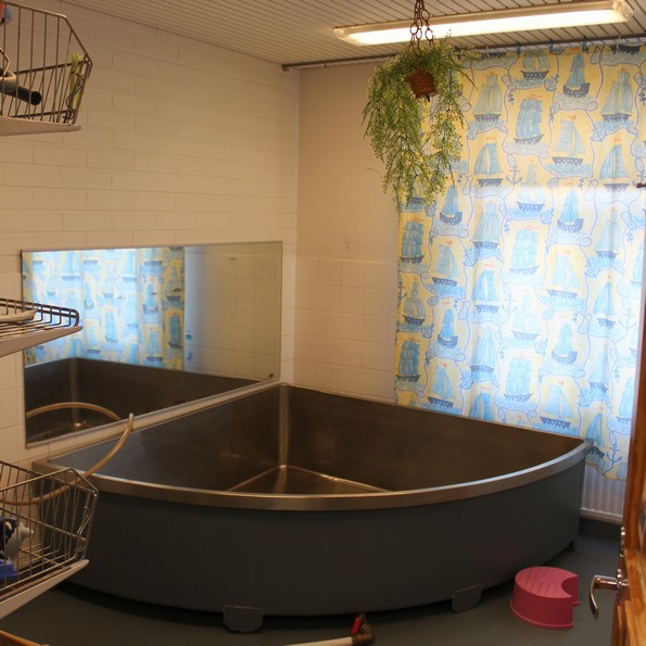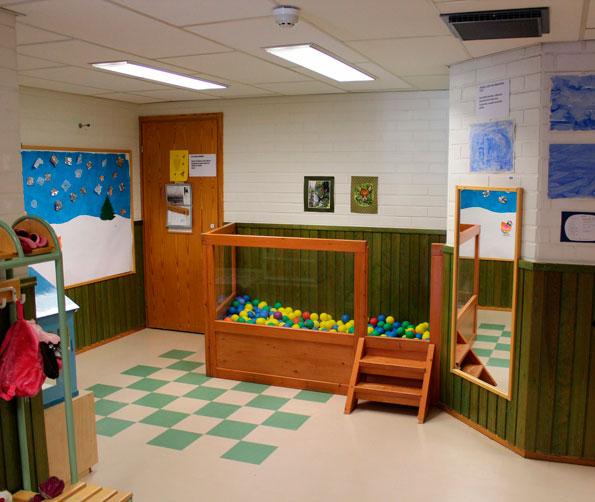 Päiväkodista löytyy myös ihan mukavan oloinen vesileikkihuone. Ei tuo nyt ihan superviihtyisäksi ole tuunattu, mutta kelpaisihan tuossa päivän mittaan kökkötellä.
