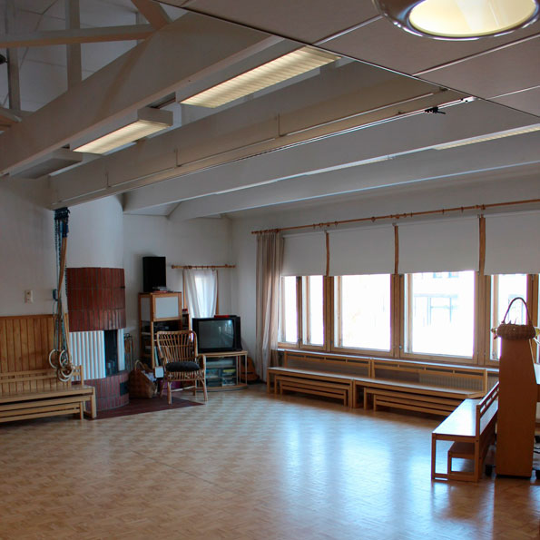 Liikuntasalin reunassa on myös sympaattinen tulisija. Jos olisin täällä päivähoidossa, yrittäisin varmaan viritellä aika ajoin tulta kun kukaan ei katsoisi perään.