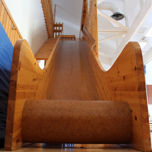 Tässä oma suosikkini. Liikuntasalin yläkerrasta pääsee alakertaan liukumalla.