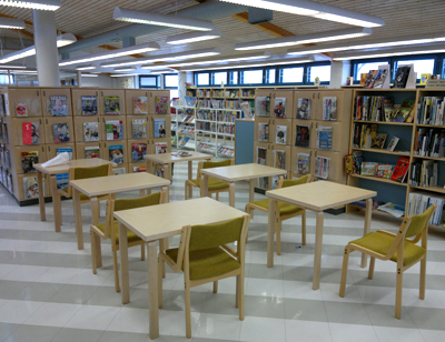 Kauklahden kirjastosta tulee mieleen Viherlaakson kirjasto. Kun pieni kirjasto on yhtä tilaa, tuntuu kirjasto kokoaan suuremmalta.