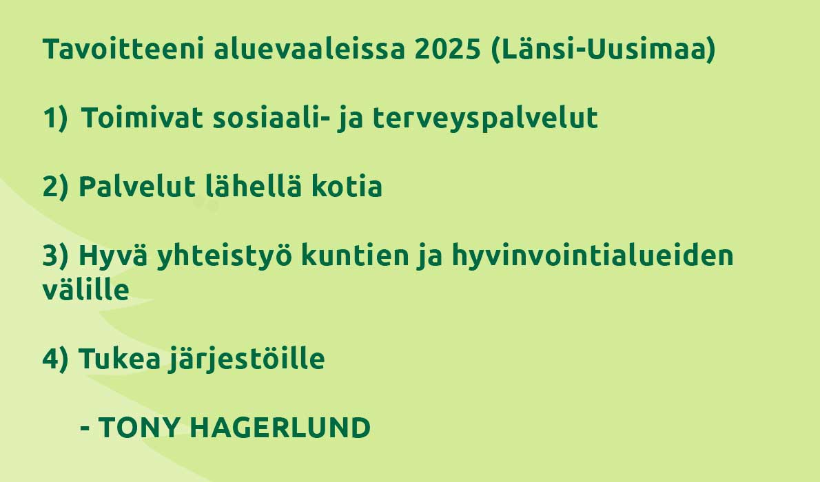Olen ehdolla aluevaaleissa huhtikuussa 2025. Olen koulutukseltani lähihoitaja ja valtiotieteiden maisteri. Tämän koulutustaustani sekä laajan työkokemukseni (mm. kehitysvammaisten ohjaaja, kunta-alalla kehittämispäällikkö) ja luottamustehtävieni ansiosta (mm. HUS:n hallituksen varajäsen, Espoon sosiaali- ja terveyslautakunnan sekä perusturvajaoston jäsen, sekä sote-alan järjestökokemus) minulla on erinomaiset lähtökohdat olla linjaamassa hyvinvointialueen toimintaa sekä käytännön tasolta että laajojen kokonaisuuksien kannalta.
