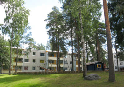 Koulun vieressä on kerrostalo, jossa on aikoinaan ollut opettajien asuntoja.