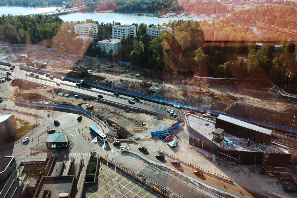 Etualalla Keilaniemen metroaseman rakennustyöt. Taustalla Otsolahti.
