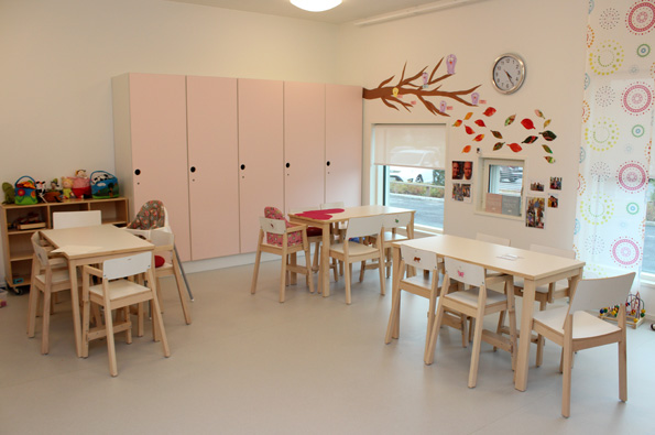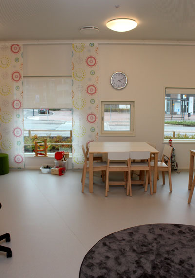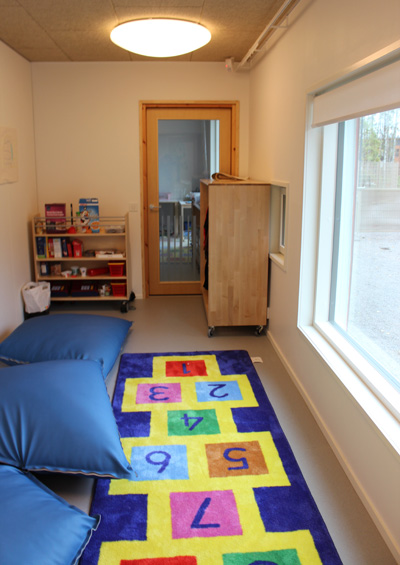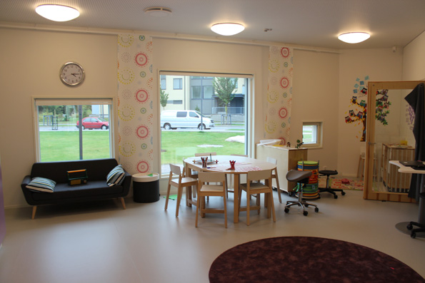 Jännä innovaatio. Ryhmien lepo- ja leikkihuoneet ovat yhteydessä toisiinsa. Toisin sanoen sama aikuinen voi vahtia viimeisiä nukkuvia laosia kahdestakin eri ryhmästä, ja leikkitiloja voidaan käyttää ristiin. Tehokasta ja järkevää tilankäyttöä.