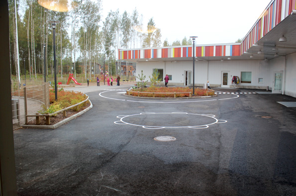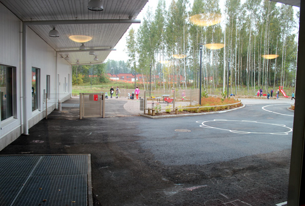 Uusissa päiväkodeissa on satsattu katoksiin: sateellakin voi ulkoilla, ja tarvittaessa "koko päiväkoti" mahtuu katoksen alle suojaan.
