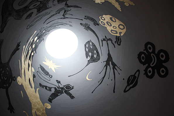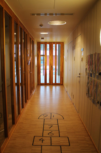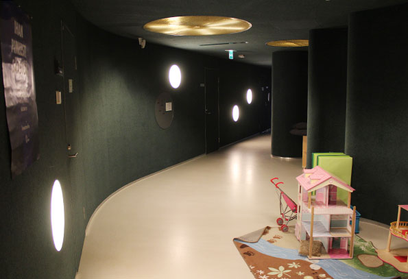 Keskellä päiväkotia hypätään hobittiluola-tunnelmiin. Seinä on jotain kangasmista materiaalia. Oikealla olevista syvennyksistä pääsee ryhmä- ja lepohuoneisiin.